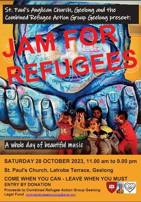 “Jam for Refugees” in Geelong is a 10-hour concert, to benefit refugees in our area, Saturday Oct 28th at St Paul’s in Latrobe Terrace from 11am-9pm. Entrance is by donation, and people are encouraged to “come when you can, leave when you must.” The “Jam” will consist of a series of 30-minute time slots featuring local musicians, groups, choirs and school groups. About every 2 hours there will be a short talk (5-10 minutes) by a prominent person, someone working with refugees, or a refugee. The Jam will be opened by Libby Coker, Federal Member for Corangamite, and Fr. John Mathes, of St. Paul’s Geelong. Closing by Keith Fagg, former Mayor of Geelong.
